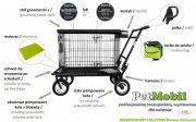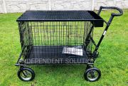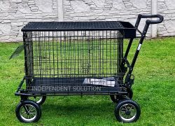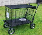 Galvanized cage has a pair of double doors. Steel. The trolley is made from best quality materials. It has three shock absorbers front and rear brakes, wheels, pneumatic (pumped), easily beats any terrain. All trolley frame is painted with powder method that is very permanent. Top cage is made of thin galvanized sheet, lined by car carpet. Also has a basket for cosmetics for your dog. Perfectly replace groomer table where the dog is calmly prepare for the show. Weight trolley the load up to 60/70kg. The entire trolley is folded, you can also take off the wheels. Folded trolley has a height about 32 cm after take off the wheels 27 cm. While the width is equal to the width of the frame. Cage also can be folded.
